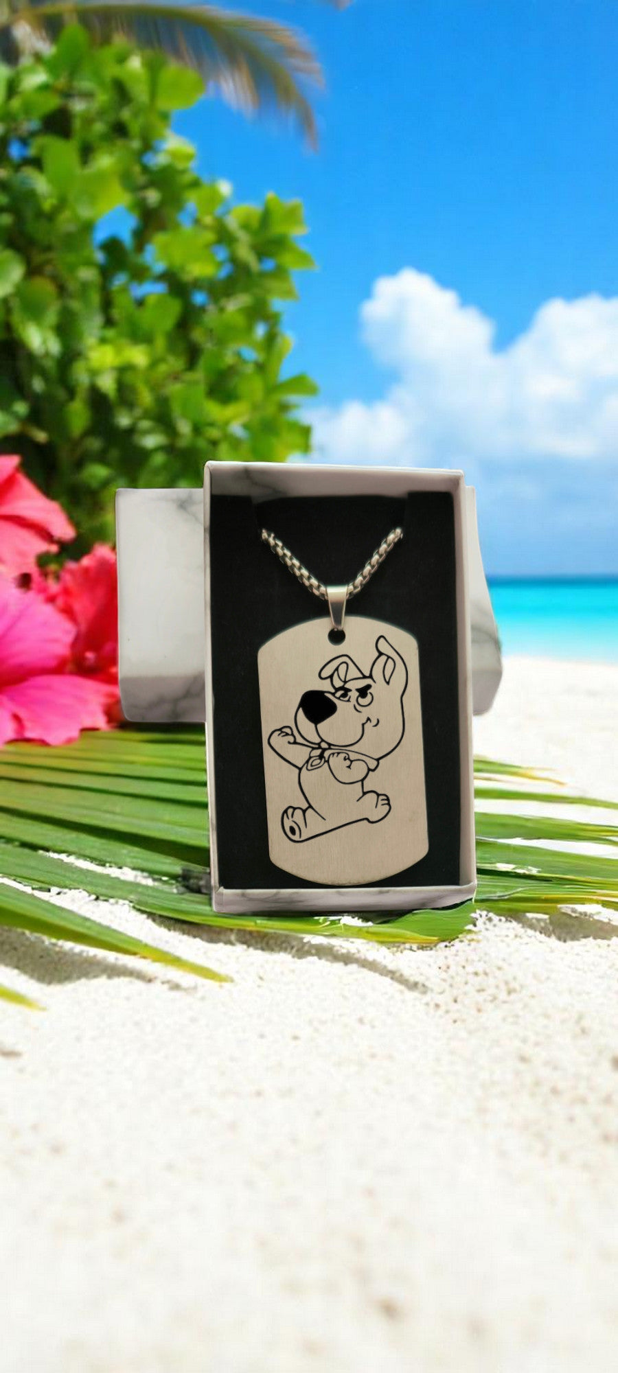 Ce collier possède une chaîne de 60cm de long avec une plaque en aluminium qui mesure 29mm de large et 49mm de long. Sur ce pendentif vous pouvez mettre un dessin, logo ou texte.