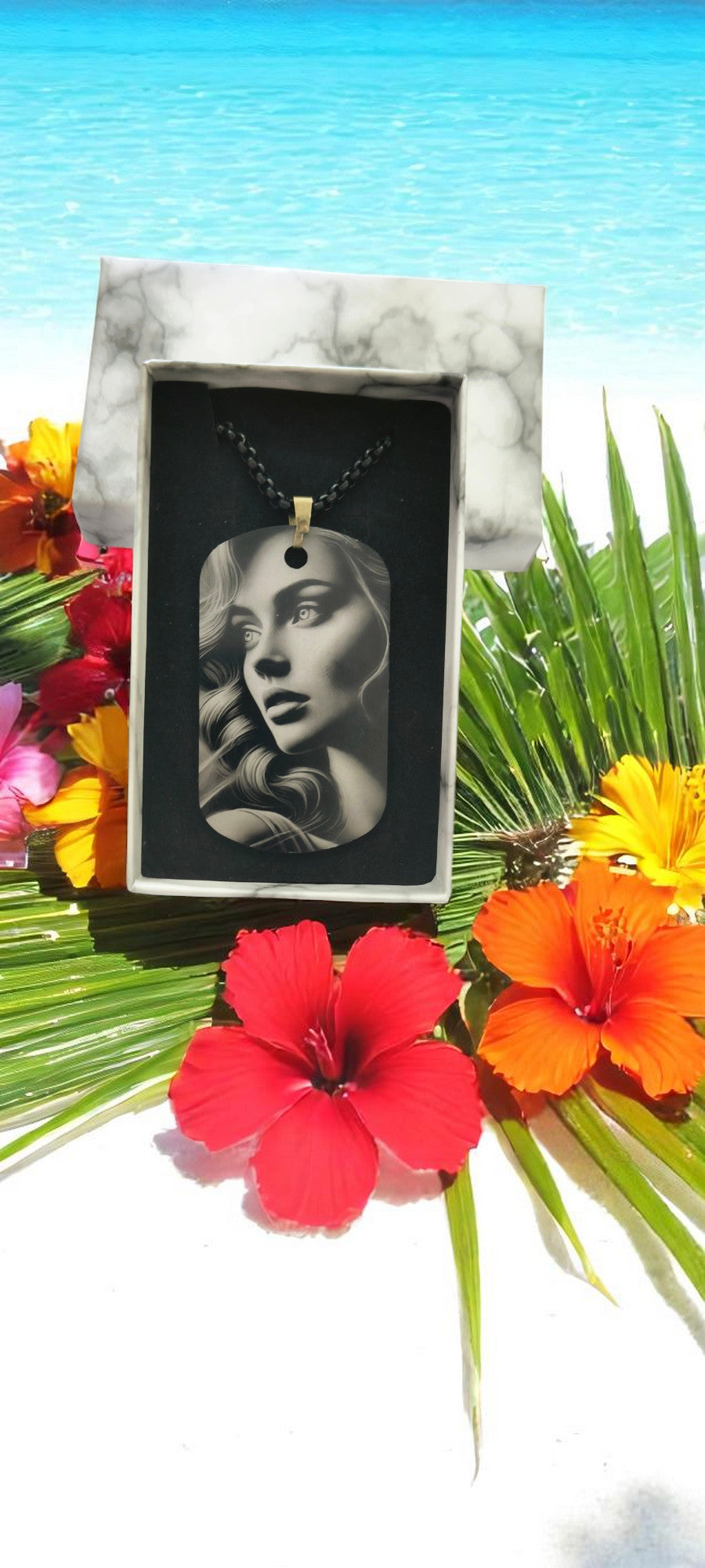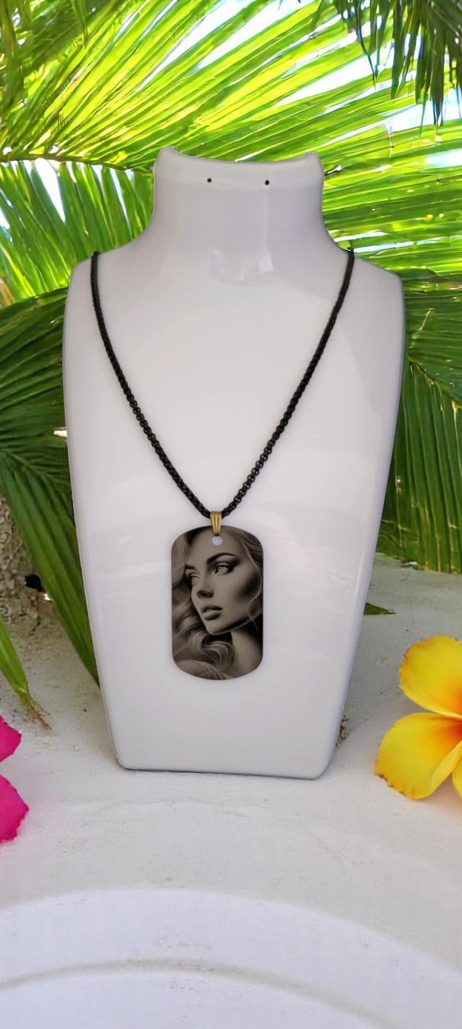 Ce collier possède une chaîne de 60cm de long avec une plaque en aluminium plaqué noir qui mesure 29mm de large et 49mm de long pour mettre vos plus belles photos.