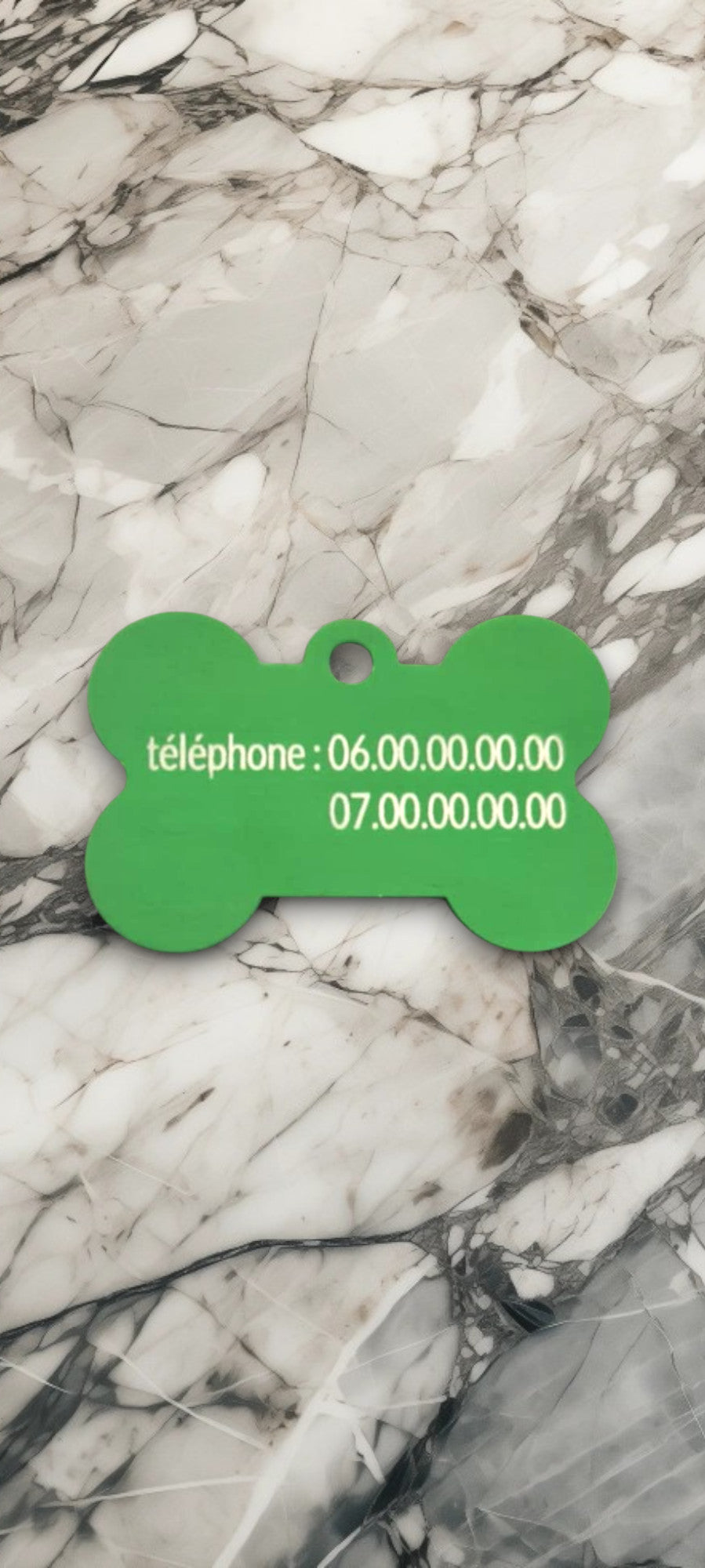 Ce médaillon pour chien personnalisable est en aluminium laqué, ce médaillon mesure 25mm long 38mm de large et 1.2mm d'épaisseur. Cette accessoire ne sera pas fourni seul puisque un anneau sera installé dessous pour qu'il puisse s'adapter à tout modèles de colliers ou de harnais.